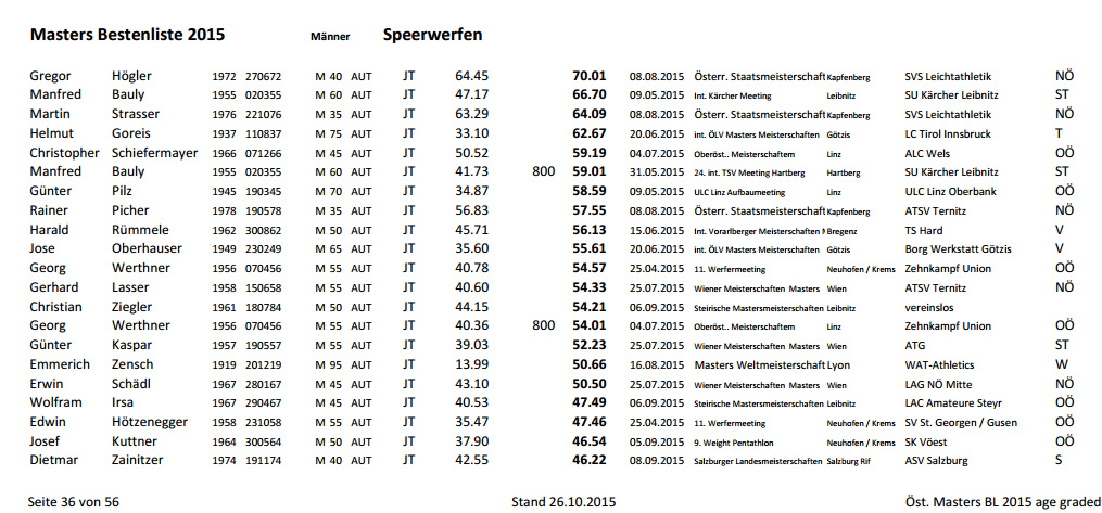 Die österr.Masters Bestenliste 2015 Speerwurf: Dr. Manfred Bauly noch immer erfolgreich aktiv